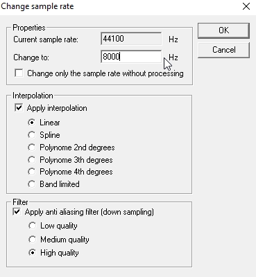 3.Αλλάζουμε δειγματοληψία σε 8000 Hz πηγαίνοντας Process -> resample -> change to – 8000