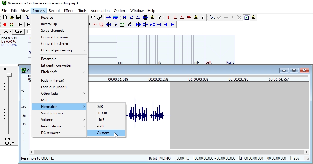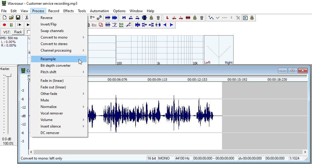 2. Μετατρέπουμε σε μονοφωνικό πηγαίνοντας Process -> Convert to mono -> left only