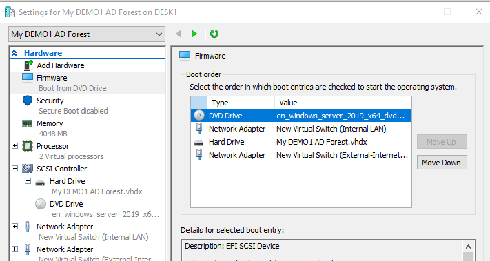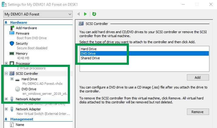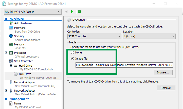 Από τον Hype-V Manager στα Windows 10, σιγουρευτείτε πως το DVD είναι το πρώτο boot devices και ότι το ISO image file έχει ρυθμιστεί σωστά.