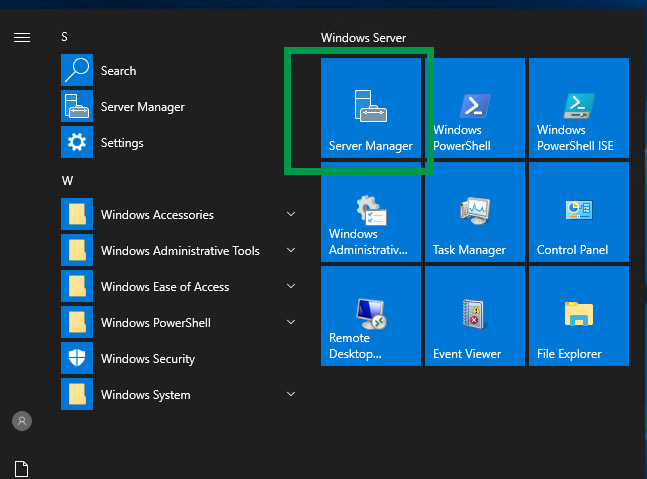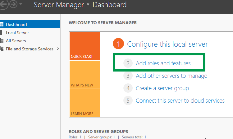 Launch “Server Manager” from the start menu and select “Add Roles and Features“.