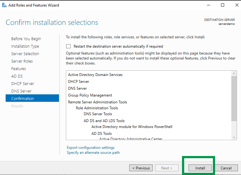 Click Next through the “Active Directory Domain Services“, “DHCP Server” and “DNS Server” screens. Click “Install” to confirm and begin the roles install.