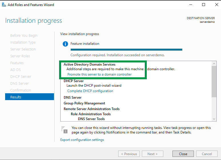 Once the role features installation begins, do not close the Window. We will select the “Promote this server to a domain controller” step in a few minutes.