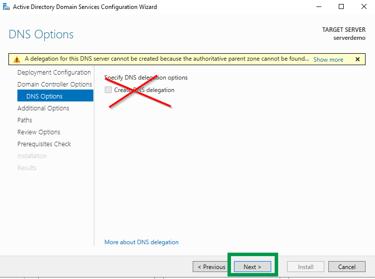 Click Next at the DNS Options screen and DO NOT check the box to create a DNS delegation.