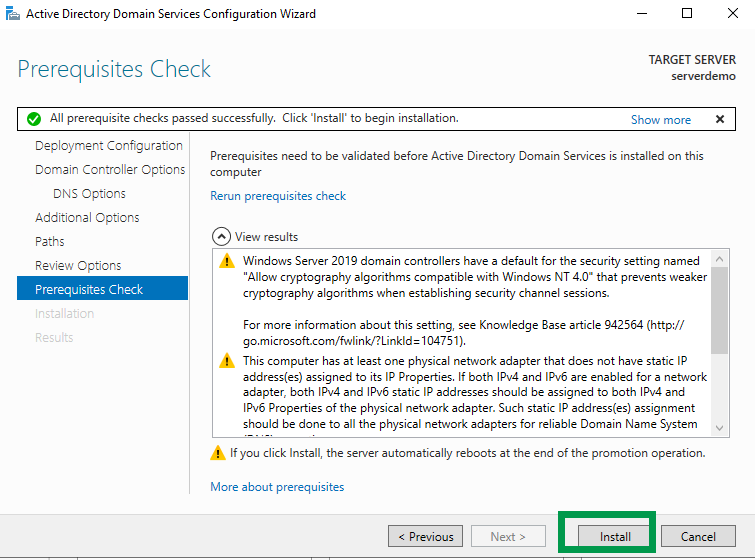 Click Next at the Additional Options, Paths, Review Options, and Prerequisites Check screens. Click “Install” to continue.