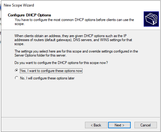Click Yes I want to configure these options now on the DHCP options screen.