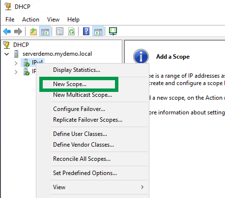 Finally, we can create the DHCP client scope. Right-click on “IPv4” option, select New Scope, click Next at the welcome screen, provide a name for the DHCP scope and click Next.