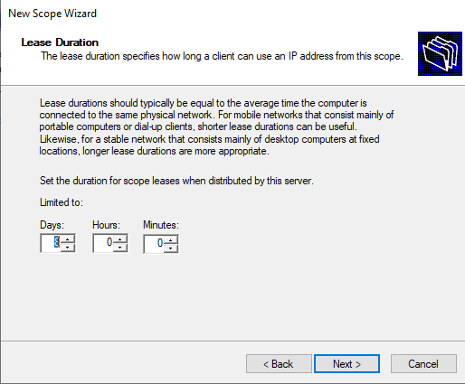 Enter the DHCP IP address range using the applicable IP subnet details you have decided to use. Click Next at the Exclusion and Delay screen, select the default 8 days for lease duration and click Next.