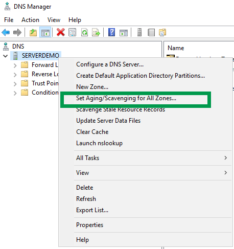 Launch DNS Manager, right-click on your DNS server, select “Set Aging/Scavenging for All Zones“. Check the box “Scavenge stale resource records” and click Ok to save the changes.