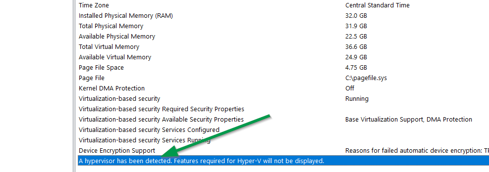 Επιβεβαιώστε ότι το λειτουργικό των Windows 10 δείχνει ότι αναγνωρίζει ένα hypervisor, ενεργοποιημένο στα BIOS/firmware και ενεργοποιήστε το Hyper-V στα προγράμματα & λειτουργίες.