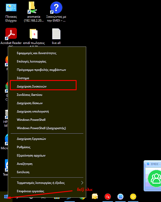 Ανοίγουμε τη διαχείριση συσκευών με δεξί κλικ στο σημαιάκι των windows.