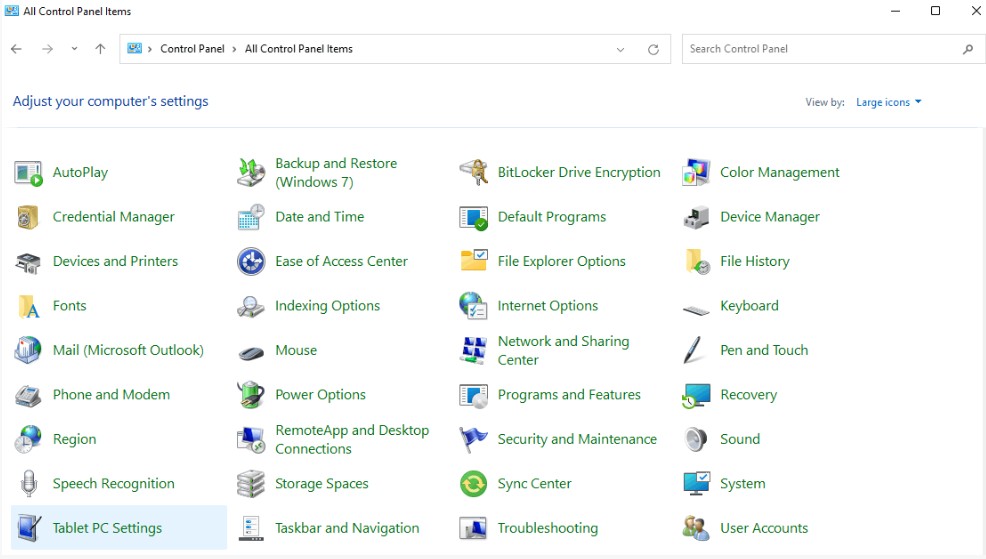 1. Ανοίγουμε το Control Panel (σε προβολή με Μεγάλα εικονίδια) και επιλέγουμε Tablet PC Settings: