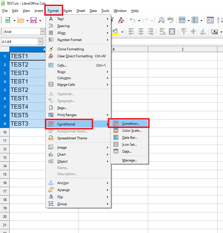 Επιλέγουμε την στήλη που θέλουμε να κάνουμε τον έλεγχο.Από το μενού κεντρικών επιλογών , επιλέγουμε το Format –> Conditional –> Condition