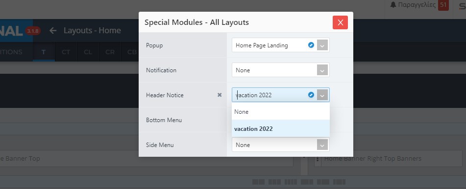 Με το που ανοίξει το Special Modules επιλέγουμε το Header Notice που έχουμε ήδη δημιουργήσει.