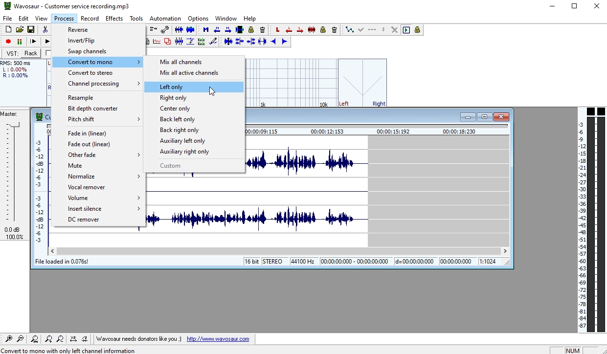 2. Μετατρέπουμε σε μονοφωνικό πηγαίνοντας Process -> Convert to mono -> left only