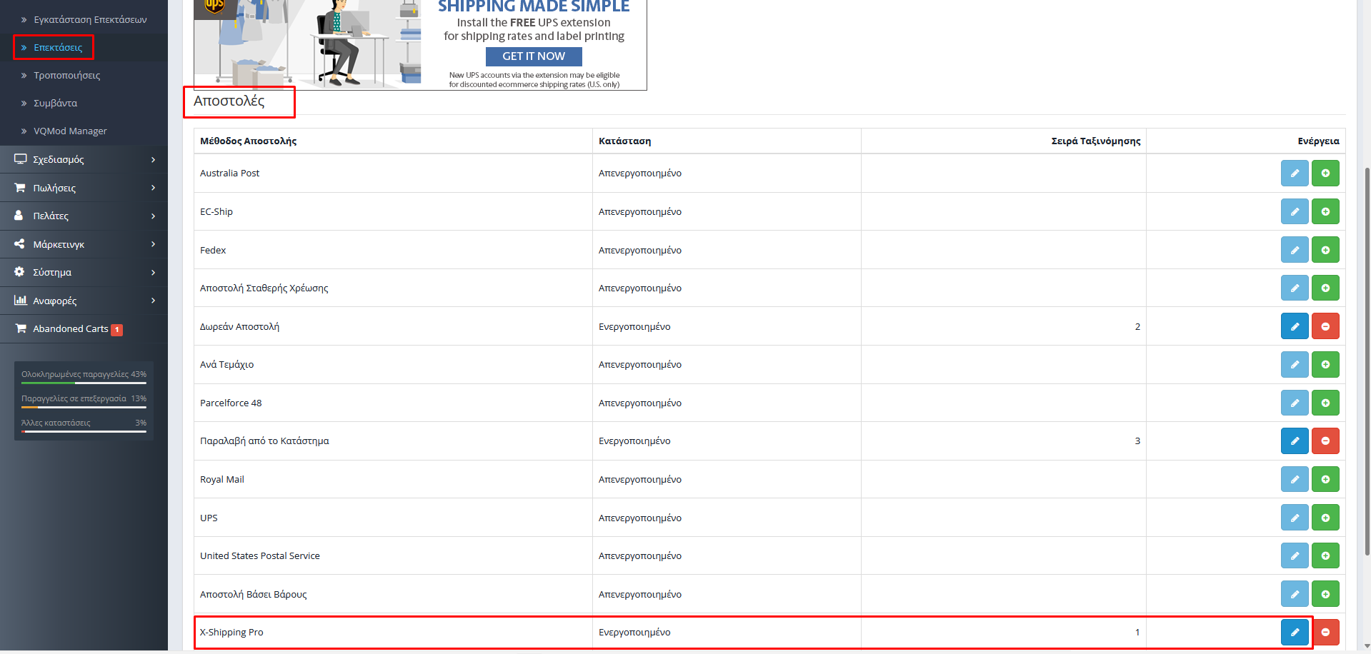 Αν χρειάζεται να φτιάξω ένα νέο κανόνα για τα μεταφορικά θα πρέπει να πάω στις Επεκτάσεις από το main menu,επεκτάσεις ,να επιλέξω Shipping/Αποστολές ύστερα επιλέγω το plugin X-Shipping Pro στο κουμπί με το μολυβάκι για να μου ανοίξει η σελίδα του X-Shipping Pro.