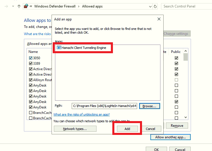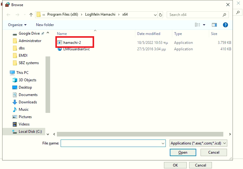 Στην επιλογή allow another app θα βάλω το path απο το hamachi που έκανα copy πριν και στο φάκελο 64 διαλέγω την εφαρμογή hamachi-2.