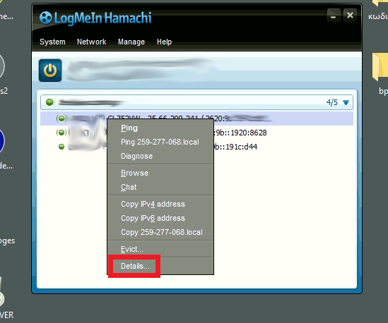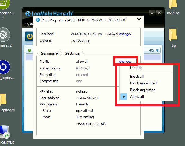 Μετά θα πρέπει να πάω ξανά στο hamachi να κάνω ένα restart και στη κάθε σύνδεση να πατήσω δεξί κλικ –> details –> settings –> traffic–>change–>allow all και τέλος πάλι ένα restart το hamachi.