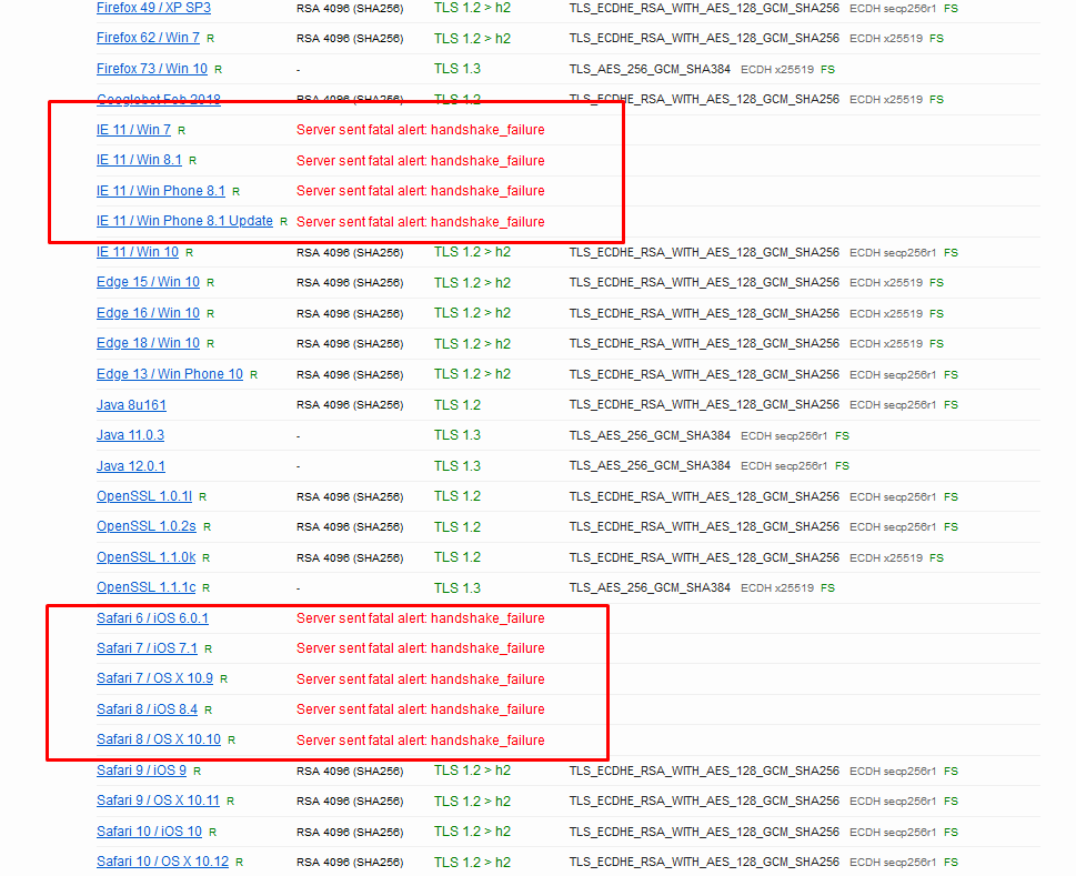 Εμφανίζεται το μήνυμα “Server sent fatal alert: handshake_failure” στους browsers που δεν υποστηρίζονται.
