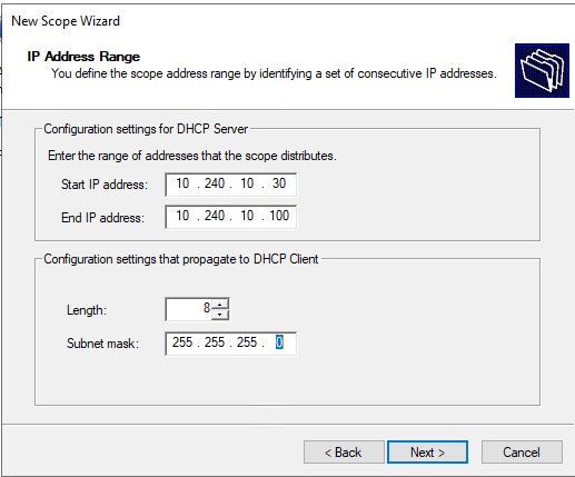 Click Next through the remaining DHCP scope screens to activate the DHCP client scope.