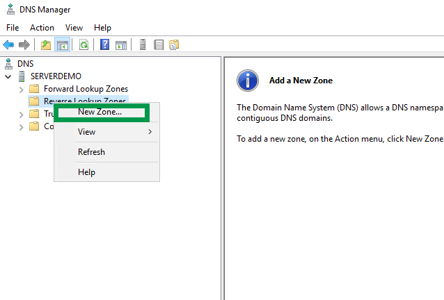 Launch the DNS Manager tool from “Windows Administrative Tools” > expand your server > right click on “Reverse Lookup Zones” and select “New Zone“. Click Next at the welcome screen.