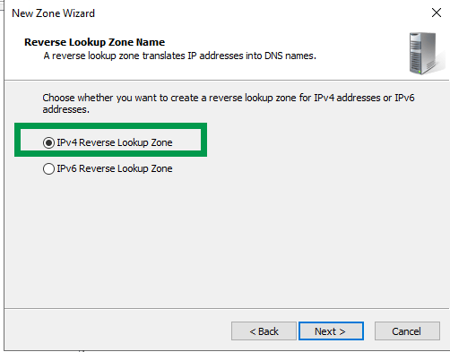Select “IPv4 Reverse Lookup Zone” and click Next.