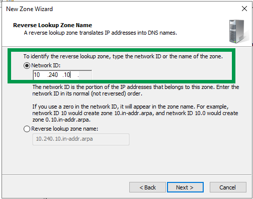 Reverse Lookup Zone name Network ID should be your environments subnet network. In my case it’s 10.240.10.